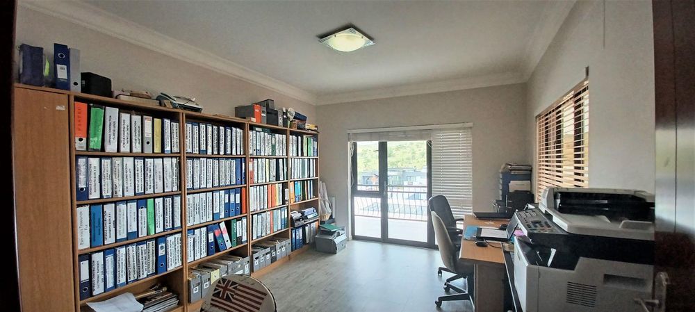 Upstairs you’ll find the luxurious master suite, complete with a walk-in dressing room, full bathroom and a private balcony with breathtaking views. Three spacious children’s bedrooms with built-in cupboards sit on the same level — one en-suite and two sharing a stylish family bathroom. Two bedrooms open onto a shared balcony, with beautiful elevated views. A large private office and a covered entertainment stoep complete the upper level.