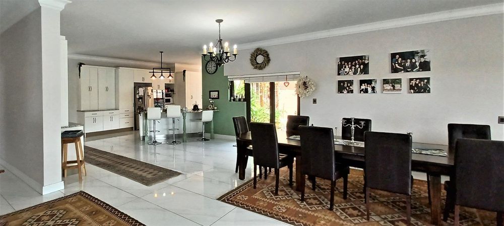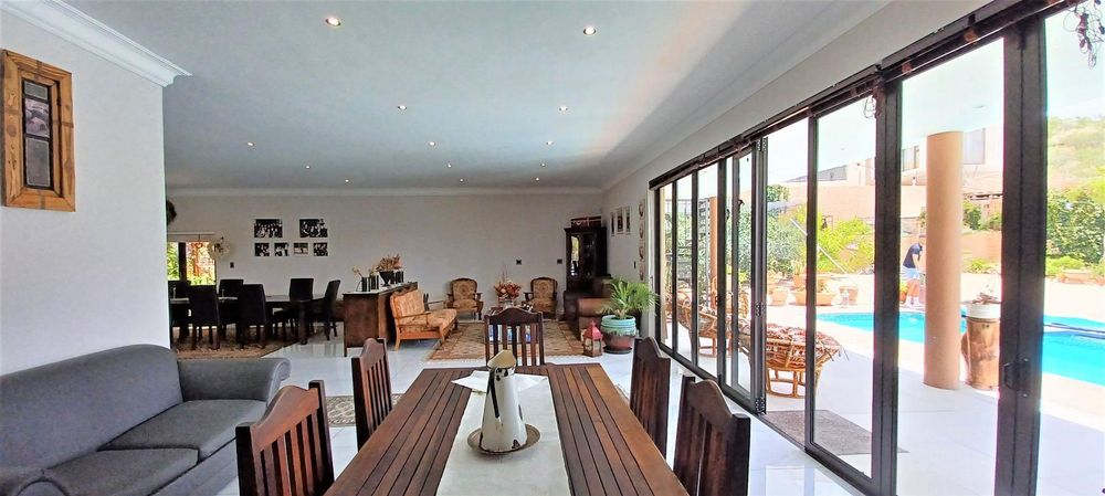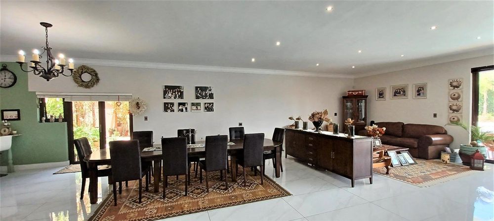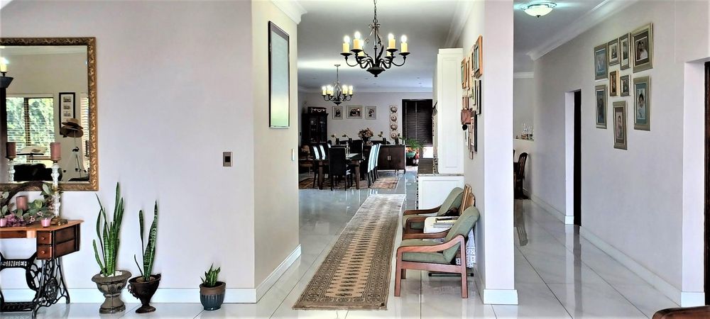 Boasting ±580m2 under roof, this elegant double-storey home has been thoughtfully designed with family living and effortless entertaining in mind. The impressive entrance hall leads you into four expansive reception and living areas, all beautifully finished and filled with natural light. These spaces flow seamlessly through stacked doors onto a large, covered entertainment veranda with a built-in braai, manageable private garden and a heated swimming pool — creating the perfect indoor–outdoor lifestyle.